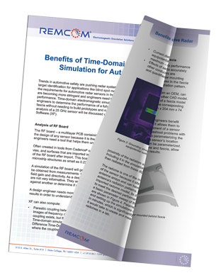 This whitepaper demonstrates how XFdtd's time-domain EM simulation enables rapid development by allowing engineers to determine the performance of a fully detailed sensor model installed behind a piece of fascia without needing to build prototypes and run tests in an anechoic chamber. The analysis of a 25 GHz sensor frames the discussion.