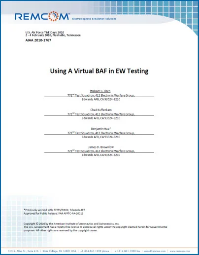 The Benefield Anechoic Facility (BAF), located at Edwards Air Force Base, is the world's largest anechoic chamber. Test requirements at the BAF have increased in complexity with the development of sophisticated manned and unmanned systems; as a result, ways to improve existing test methods are important. A “Virtual BAF” 3D modeling and simulation tool is proposed to be used to assess test set up and produce simulation model results. This Virtual BAF simulation tool is a software model of the anechoic chamber and uses the uniform theory of diffraction to predict the RF field environment in the BAF. The Virtual BAF 3D computer simulation model uses Remcom's XGtd ray-tracing electromagnetic simulation software to provide a preliminary RF analysis of test setup. This paper presents the major components of the “Virtual BAF” simulation model as well as a few examples of its use in preliminary test design and setup.