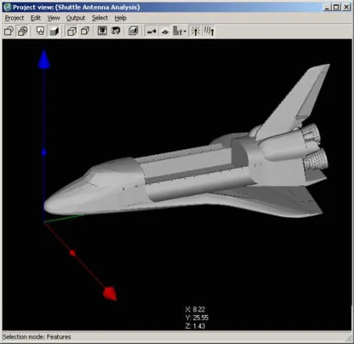 The following example demonstrates XGtd's abilities to import geometry from CAD files and calculate received power and far zone antenna gain patterns for a transmitter located in the cargo bay of the space shuttle.