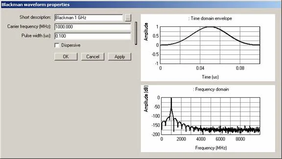 A 1 GHz Blackman pulse was used as the transmitter's waveform. The parameters defining this waveform are visible in the properties window in Figure 3.