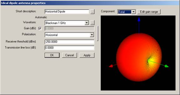 The transmitter was modeled using a horizontally polarized, ideal dipole antenna. To verify antenna patterns, 2D cut planes and full 3D plots can be created of the antenna gain. The dipole's antenna pattern can be viewed from the antenna's properties window (see Figure 4 or in XGtd's project view.