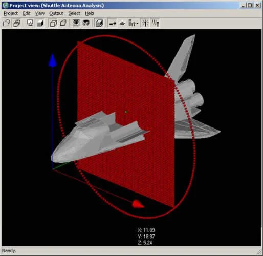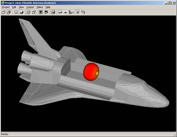 With a defined antenna and waveform, the transmitter and receivers can be added to the project. The transmitter antenna was placed in the center of the shuttle's bay as show in Figure 5. An arc of receivers and a vertical surface of receiver were added to the project to investigate the scattering of energy from the shuttle and the bay doors.