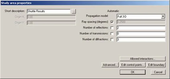 After creating the transmitter and receiver sets, all features, transmitters, and receivers in the project were enclosed in an auto-bounding study area. Propagation near the shuttle was modeled using XGtd's full 3D propagation model. The maximum number of reflections was set to 2 and the maximum number of diffractions was set to 3 in the Study Area Properties window (Figure 7).