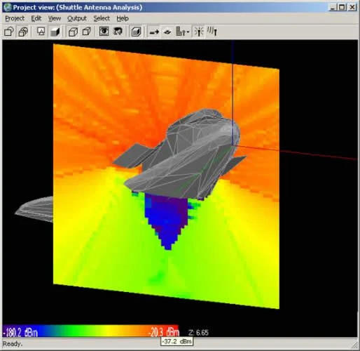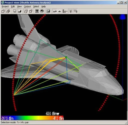 The antenna pattern of any transmitter or receiver point in the project can be displayed in the Project view (Figure 6). Viewing antenna patterns provides visual feedback that ensures antennas are oriented in the desired direction relative to the project's geometry. The horizontal dipole was oriented in the cargo bay with the dipole's nulls aligned with the length of the shuttle.