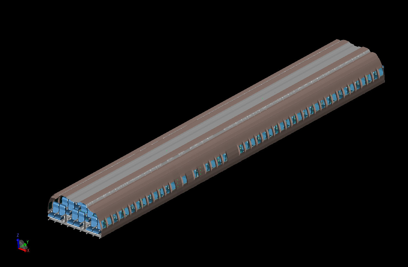 Figure 1: Three-dimensional CAD view of the aircraft cabin with some exterior surfaces removed.