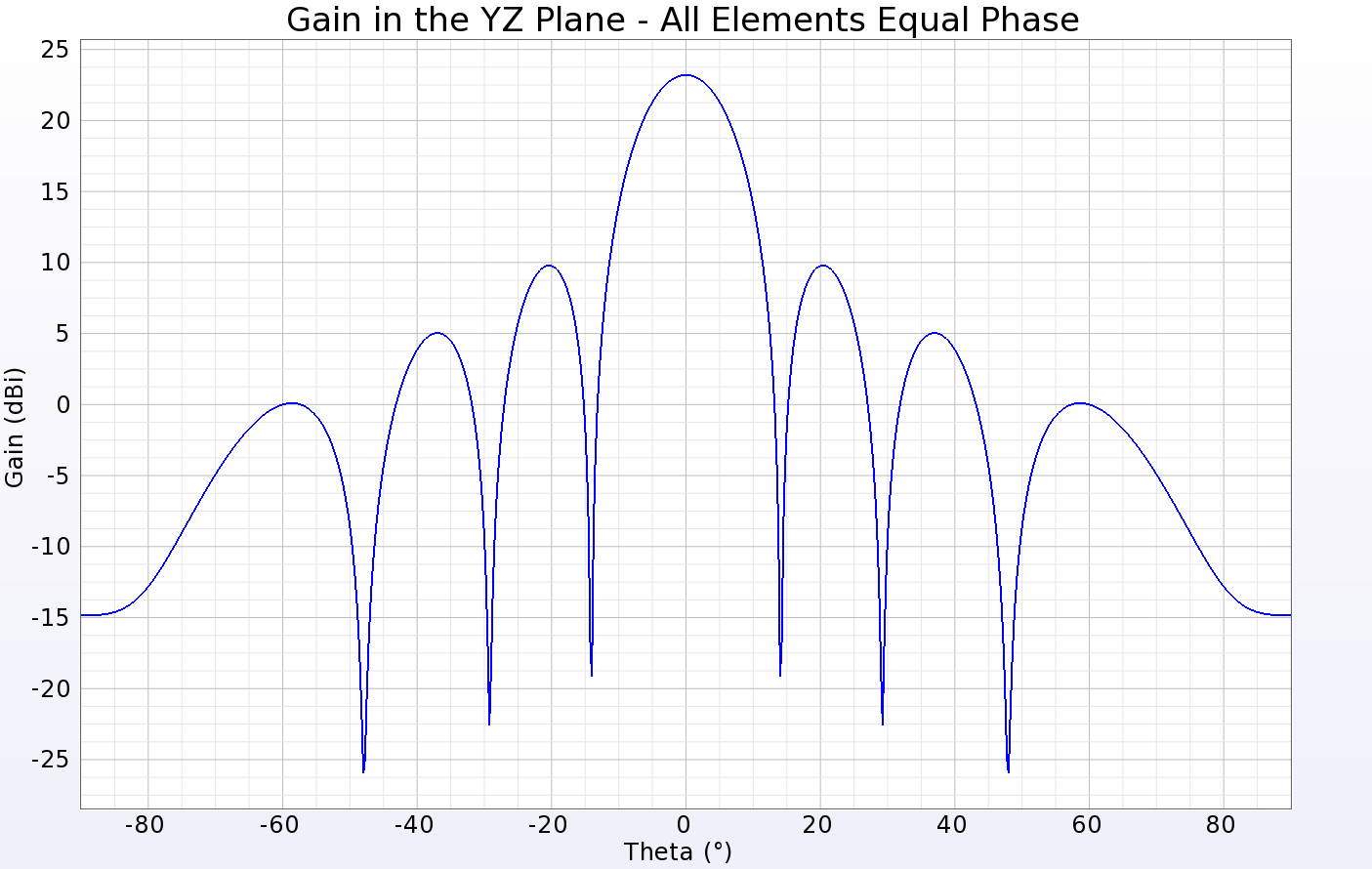 Figure 3: A line plot of the gain in a cross-sectional cut of the array pattern for the case where all patches are fed in-phase with equal amplitudes. The peak gain is just over 23 dBi and the 3 dB beamwidth is about 12 degrees.