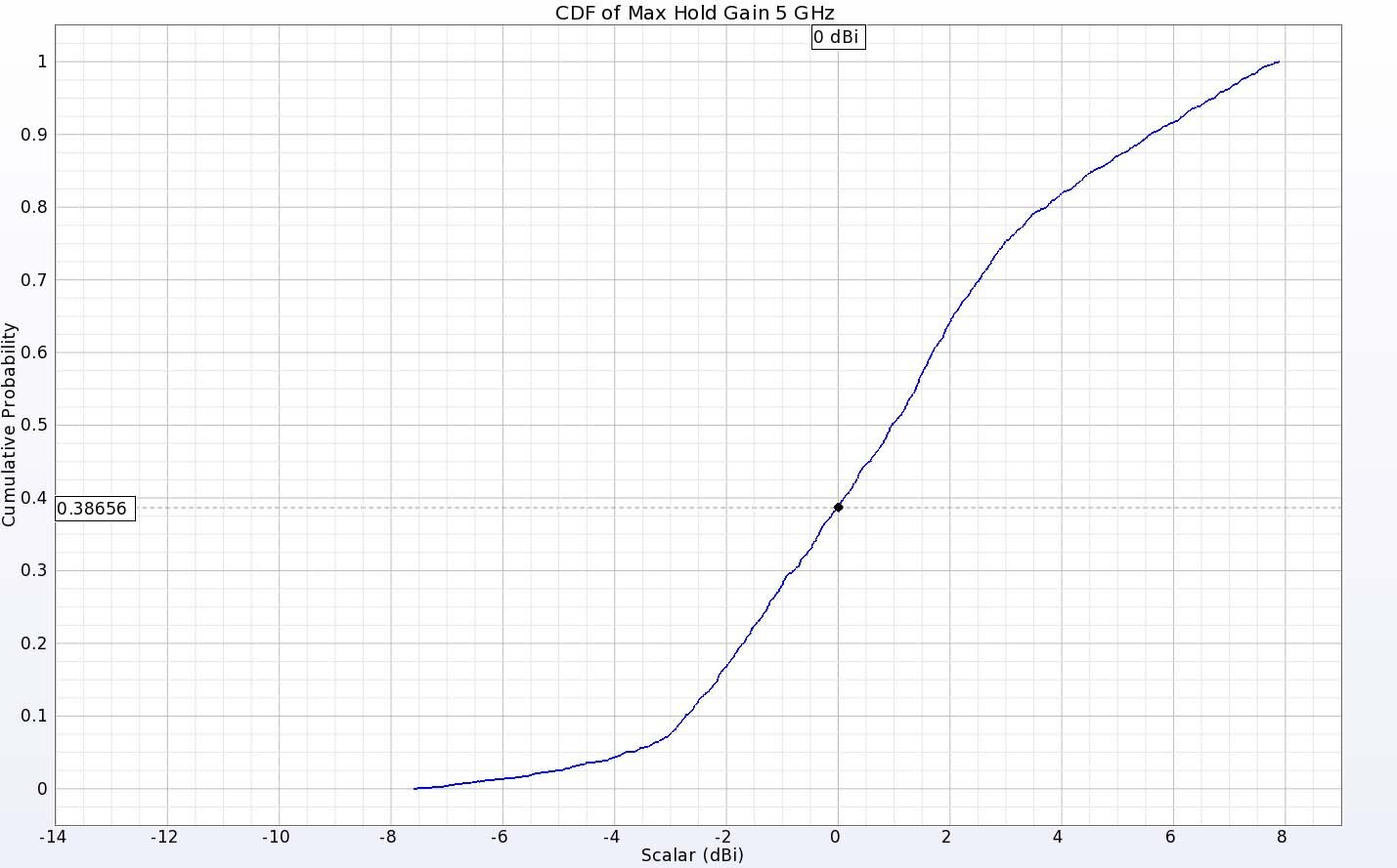 Figure 11: The CDF of EIRP plot for the two antennas at 5 GHz shows positive gain for about 60% of the directions.