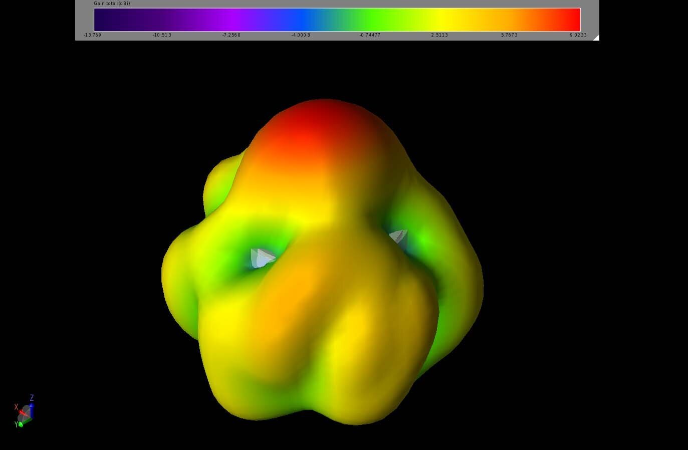 Figure 5: The gain patterns of the two antennas at 5 GHz show two narrower patterns with high gain normal to the antenna. The orientation of the image is looking directly at the front of the camera.
