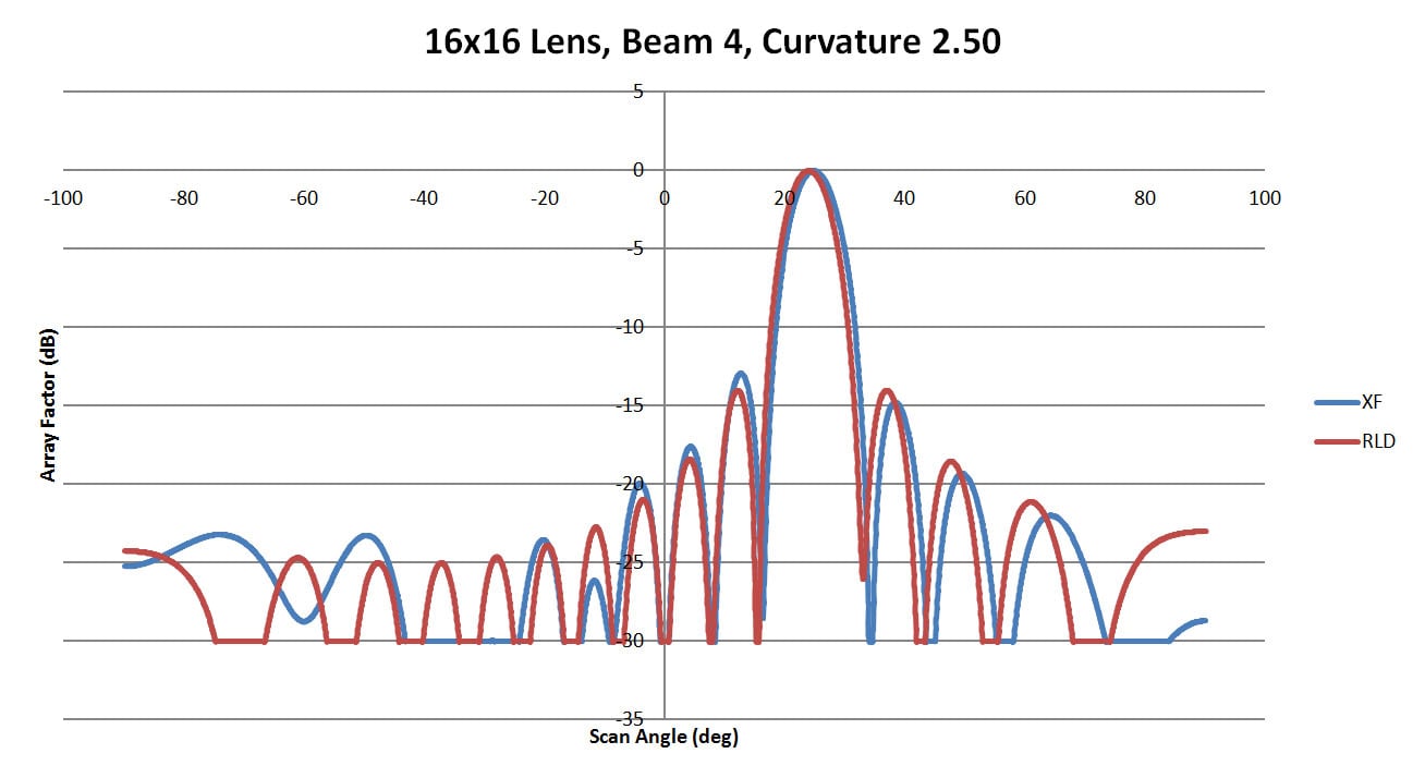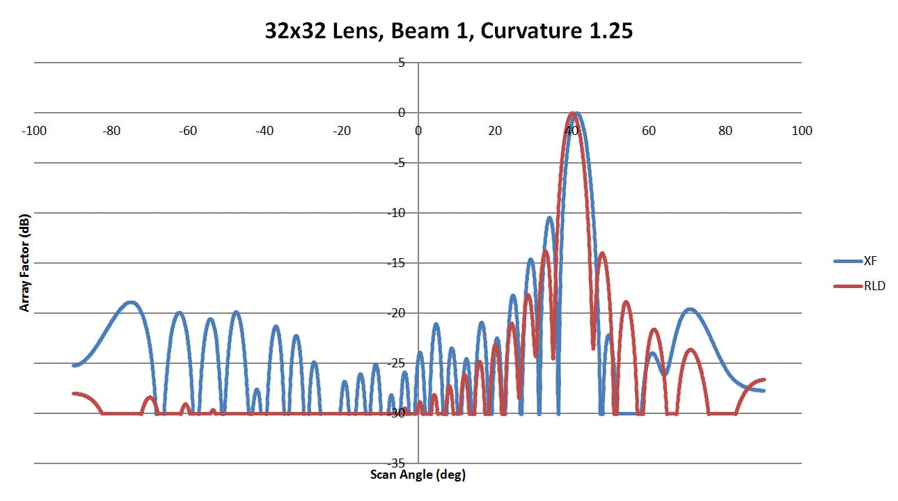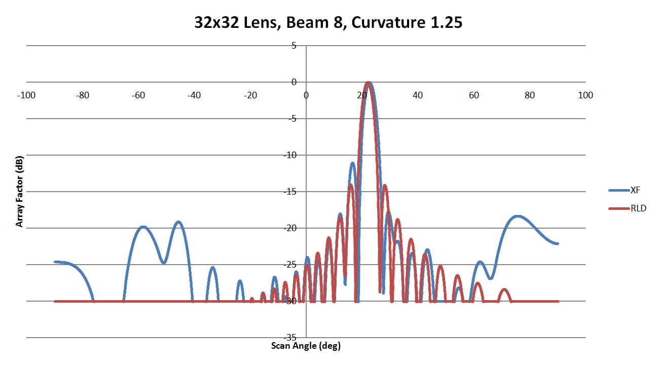 Figure 6: A comparison of beam 1 for the 8x8 lens with a sidewall curvature of 0.25 is shown. The agreement between RLD and XFdtd is marginal with an offset in the main beam and higher side lobe levels for the XFdtd case. This indicates in part that there is some difference in the results based on the sidewall curvature.