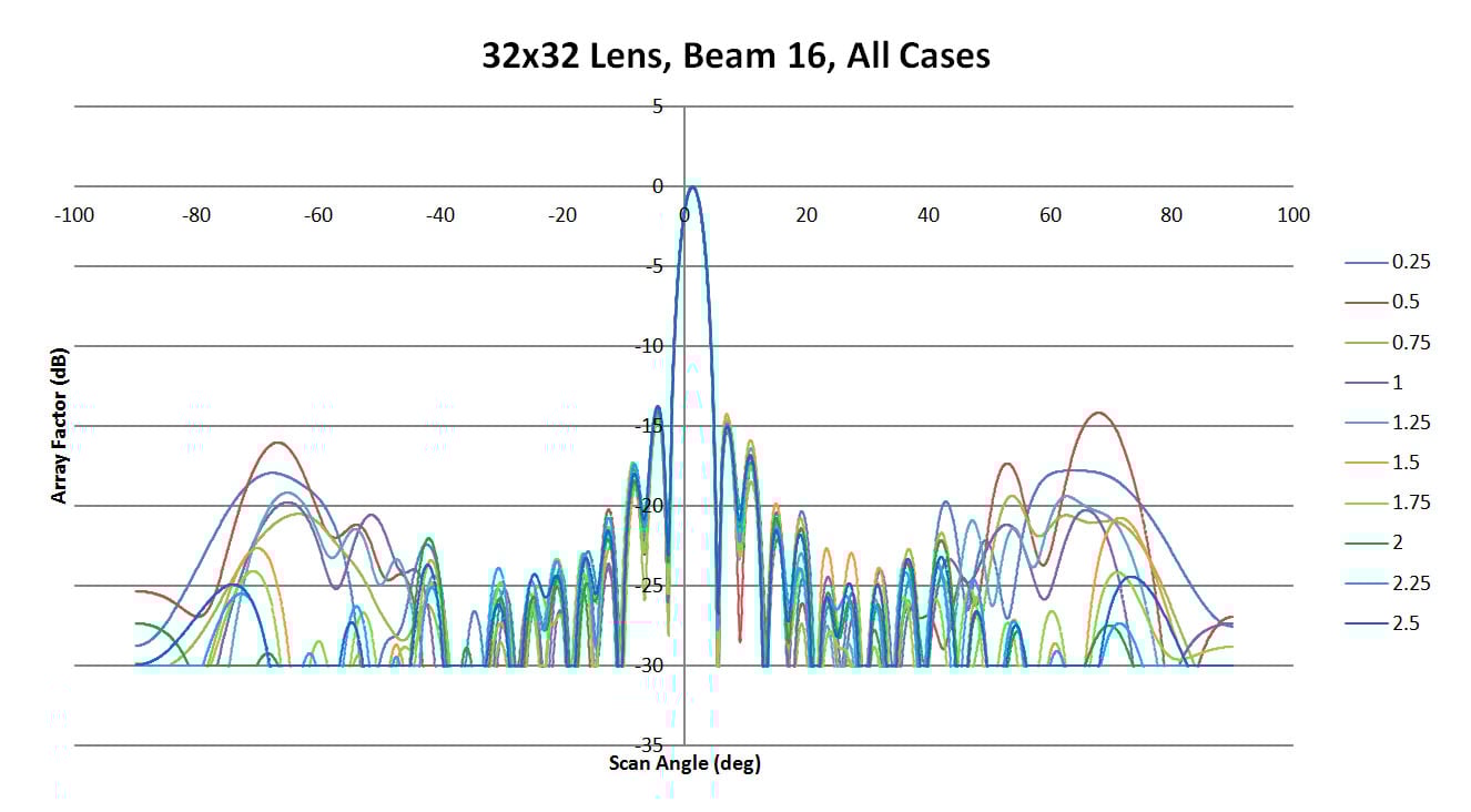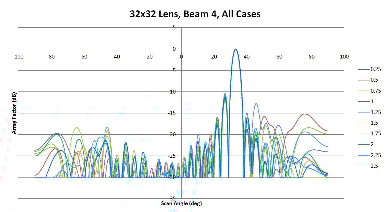 Figures 32, 33, and 34 display the maximum scan beam from port 1 for sidewall curvatures of 0.25, 1.25, and 2.5. There is a visible offset in the main beam location which improves with higher curvature; however, it never matches the ideal case exactly. The side lobe levels remain below -10 dB but are fairly high near the main beam. In the summary of all cases shown in Figure 35, it is evident there is a slight shift in the main beam location but the side lobes are fairly consistent between cases.