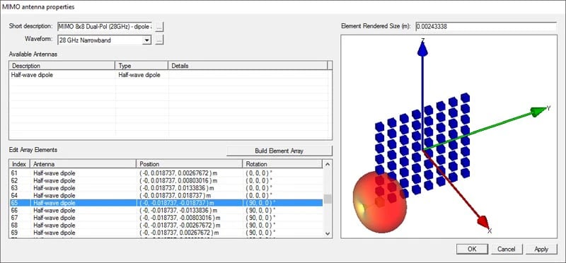 A user can select from a number of built-in antenna models, design a MIMO antenna using the MIMO array builder, or import antenna patterns generated from measurements or full-wave antenna-design tools such as Remcom’s XFdtd. Antennas with an associated waveform are required for both transmitters and receivers. The direction of the main beam and the rotation about the main beam can be specified, as can a noise figure, reflection efficiency factor, and a cable loss factor. In the antennas properties window, the gain pattern can be viewed using a specified waveform in vertical, horizontal, left-hand circular and right-hand circular polarizations as well as the total gain.
